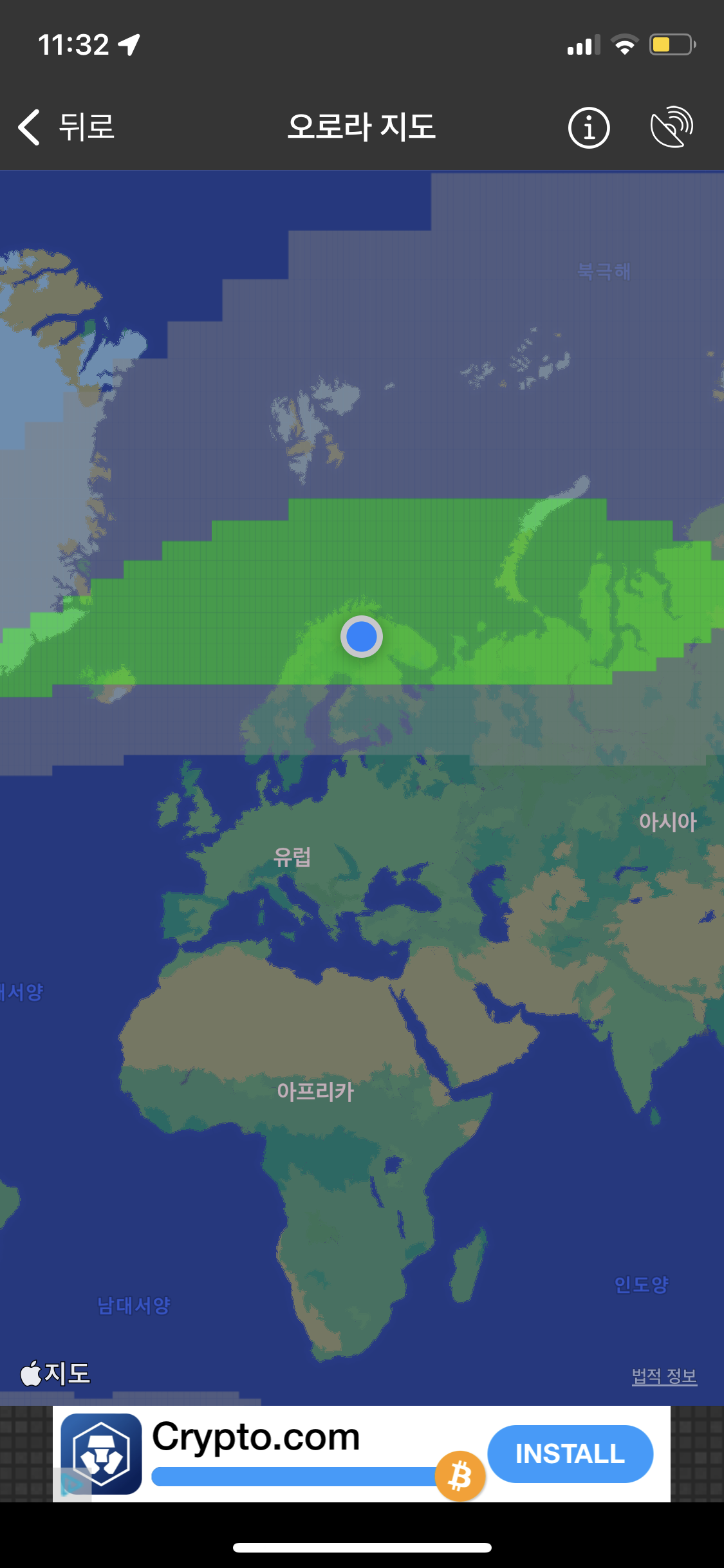 오로라 지도 어플을 보니 오로라가 떡하니 우리 위에 있는 게 아닌가!!